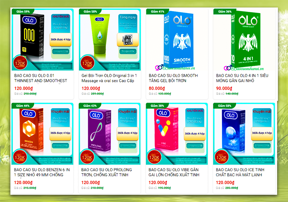 - Bao cao su: bao cao su OLO Việt Nam, bao cao su Sagami Nhật Bản, bao cao su Durex Thái Lan, bao cao su Powermen, bao cao su Michio, bao cao su Zere O2, bao cao su okamoto, bao cao su Cá ngựa Long Shock, bao cao su đôn dên, bao cao su siêu mỏng, bao cao su size nhỏ, bao cao su size lớn, bao cao su silicon dùng nhiều lần...